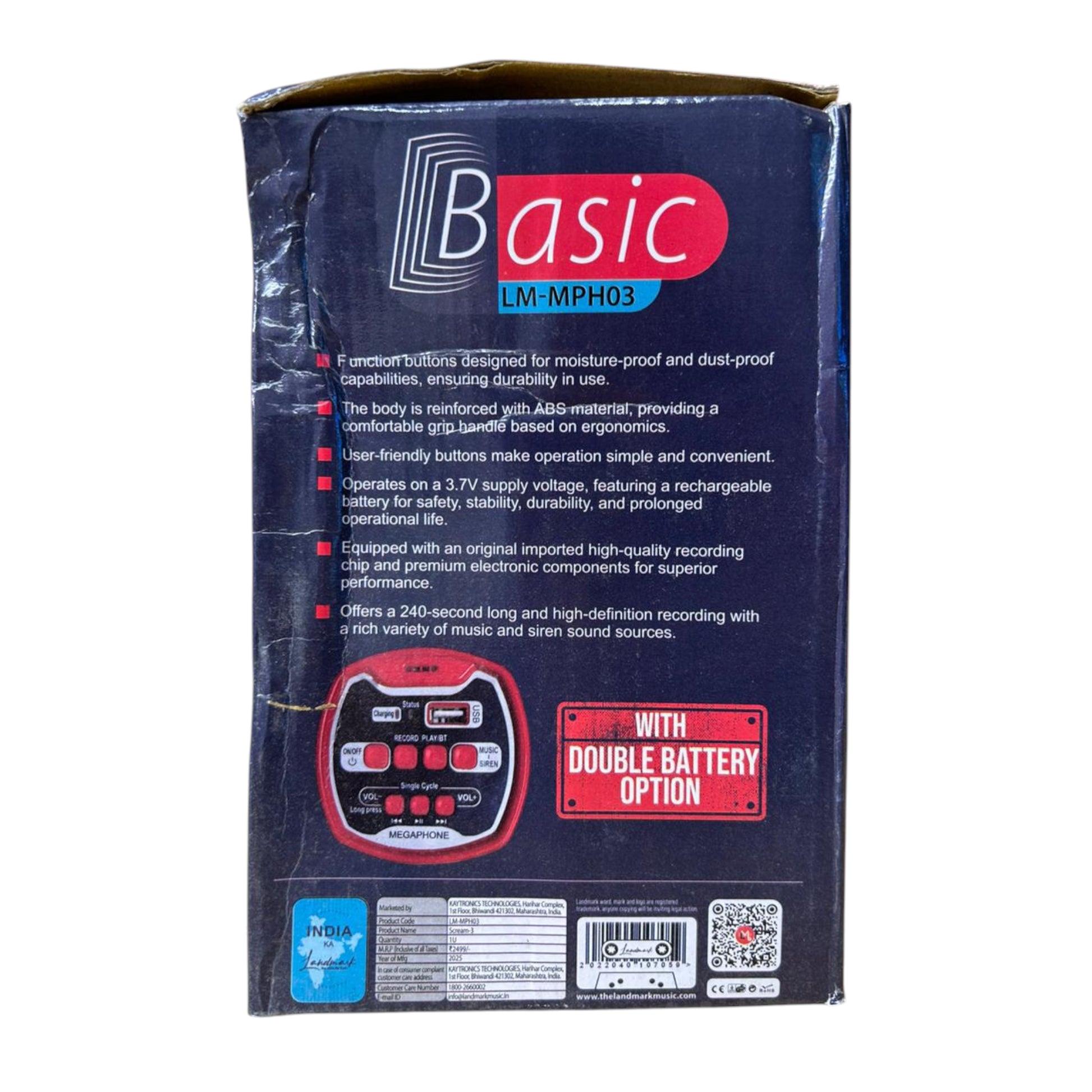 Landmark LM-MPH03 Handheld Megaphone with Rechargeable Dual Battery/USB/TF/Music/Bluetooth Power Output 200 W Max Covers a Distance Upto 500 metres